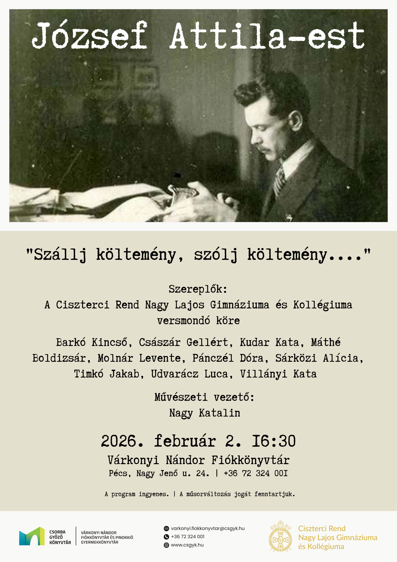 A rendezvényen kép- és hangfelvétel készül. A rendezvényen történő részvétellel Ön hozzájárul ahhoz, hogy a Csorba Győző Könyvtár azokat esetlegesen honlapján, illetőleg Facebook oldalán közzé tegye. A Könyvtár részletes adatkezelési irányelveiről a www.csgyk.hu/dokumentumtar linken tájékozódhat.