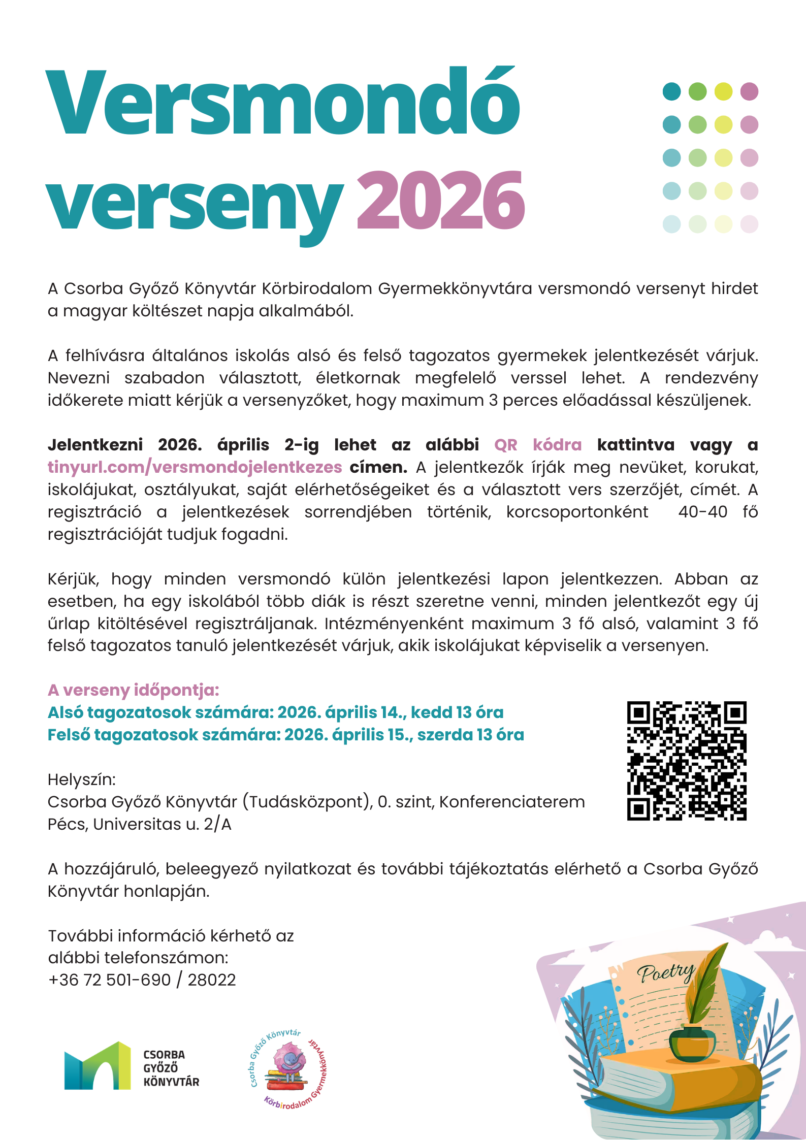 Jelentkezni 2026. április 2-ig lehet az alábbi QR kódra kattintva vagy a tinyurl.com/versmondojelentkezes címen. A jelentkezők írják meg nevüket, korukat, iskolájukat, osztályukat, saját elérhetőségeiket és a választott vers szerzőjét, címét. A regisztráció a jelentkezések sorrendjében történik, korcsoportonként 40-40 fő regisztrációját tudjuk fogadni.