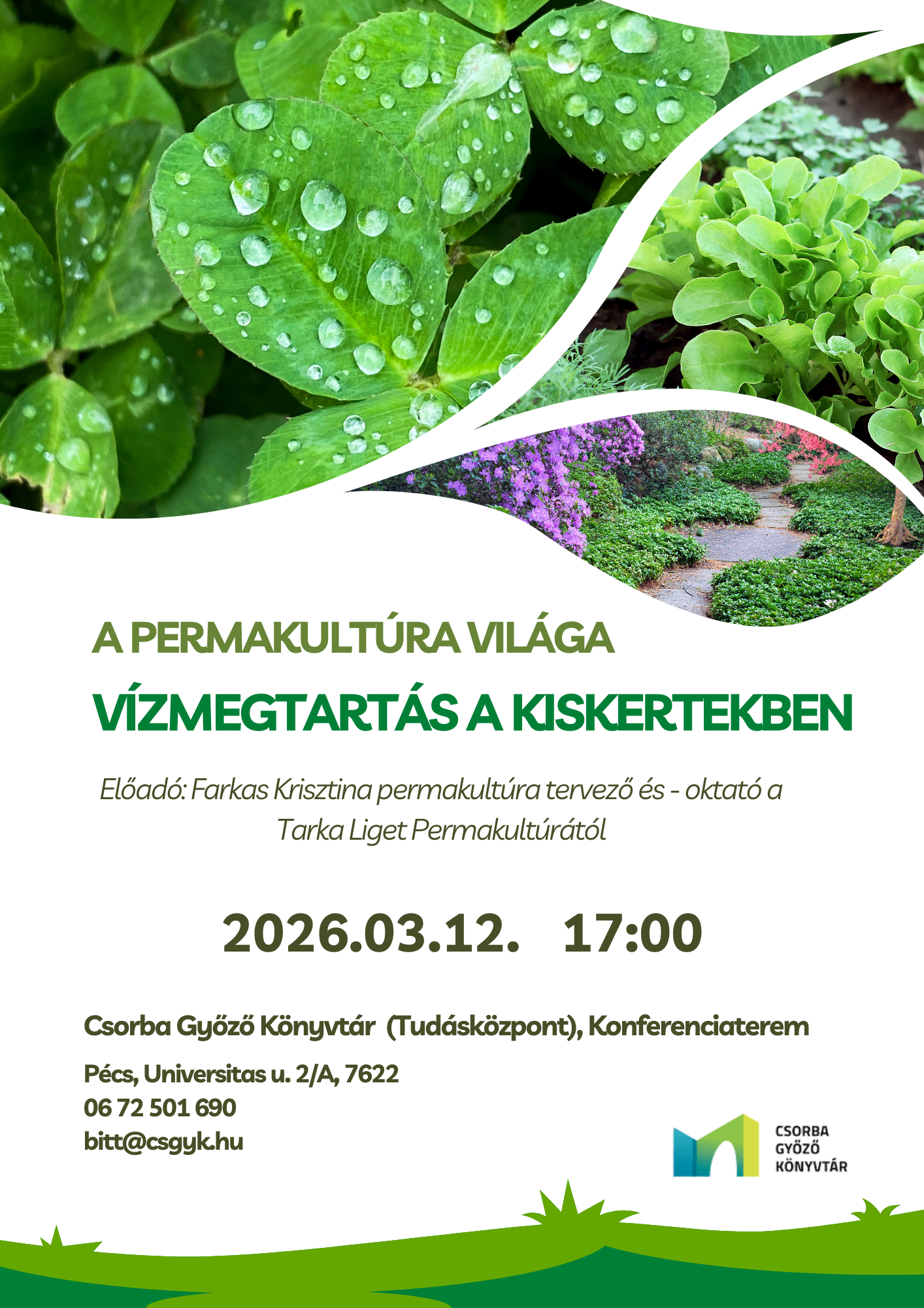 Az előadáson sorra vesszük a kiskerti vízmegtartás technikáit, melyekkel tompíthatjuk az egyre szélsőségesebb időjárás hatásait. Szó esik arról is, hogy e módszerek miként illeszthetők a permakultúrás rendszerbe úgy, hogy kis változtatással a lehető legnagyobb hatást érjük el.