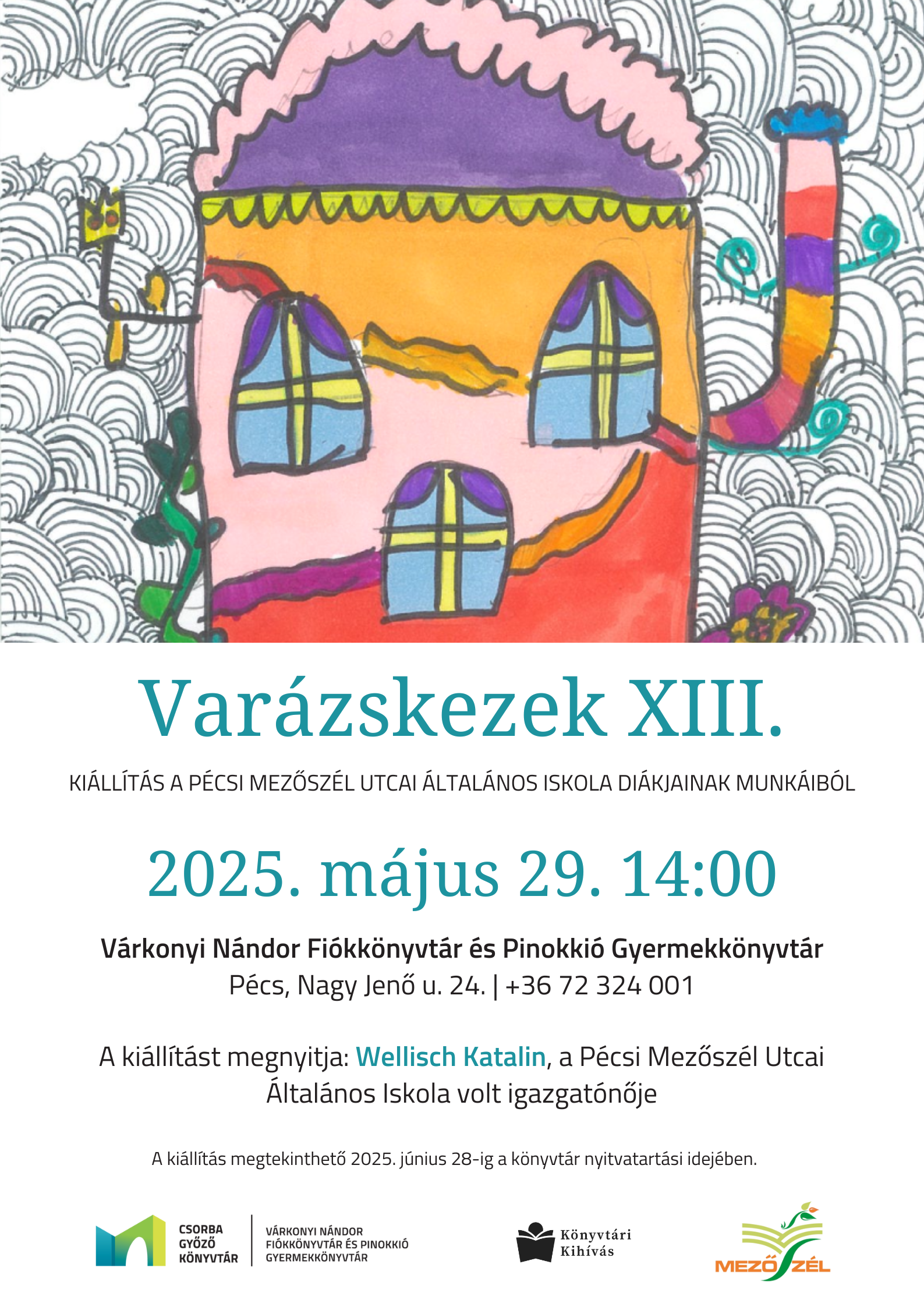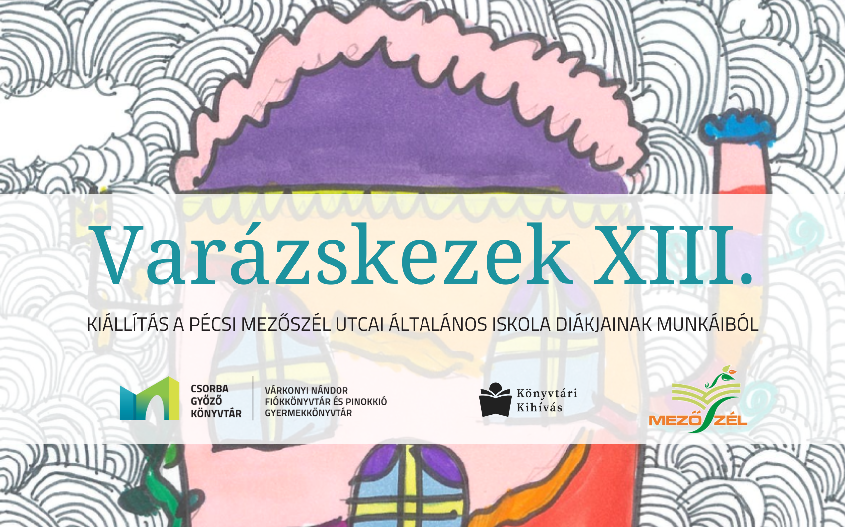 A Csorba Győző Könyvtár szeretettel meghívja Önt a Pécsi Mezőszél Utcai Általános Iskola diákjainak munkáiból rendezett VARÁZSKEZEK XIII. című kiállításának megnyitójára.