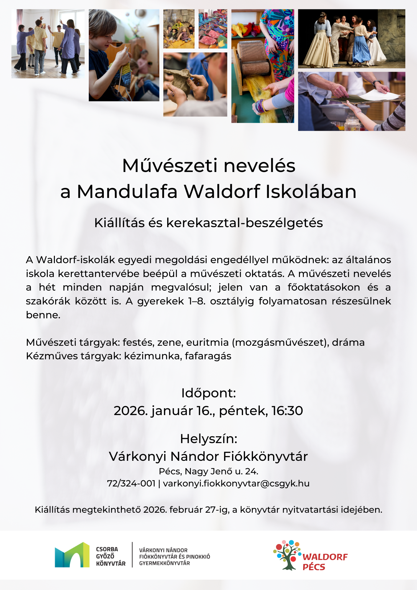 A kiállítás ezekből a tantárgyakból nyújt ízelítőt, bemutatva azokat az alkotói és pedagógiai folyamatokat, amelyek a mindennapi tanulást áthatják. A megnyitót követő kerekasztal-beszélgetésen pedagógusaink mesélnek a művészeti nevelés szerepéről és jelentőségéről a Waldorf-pedagógiában.