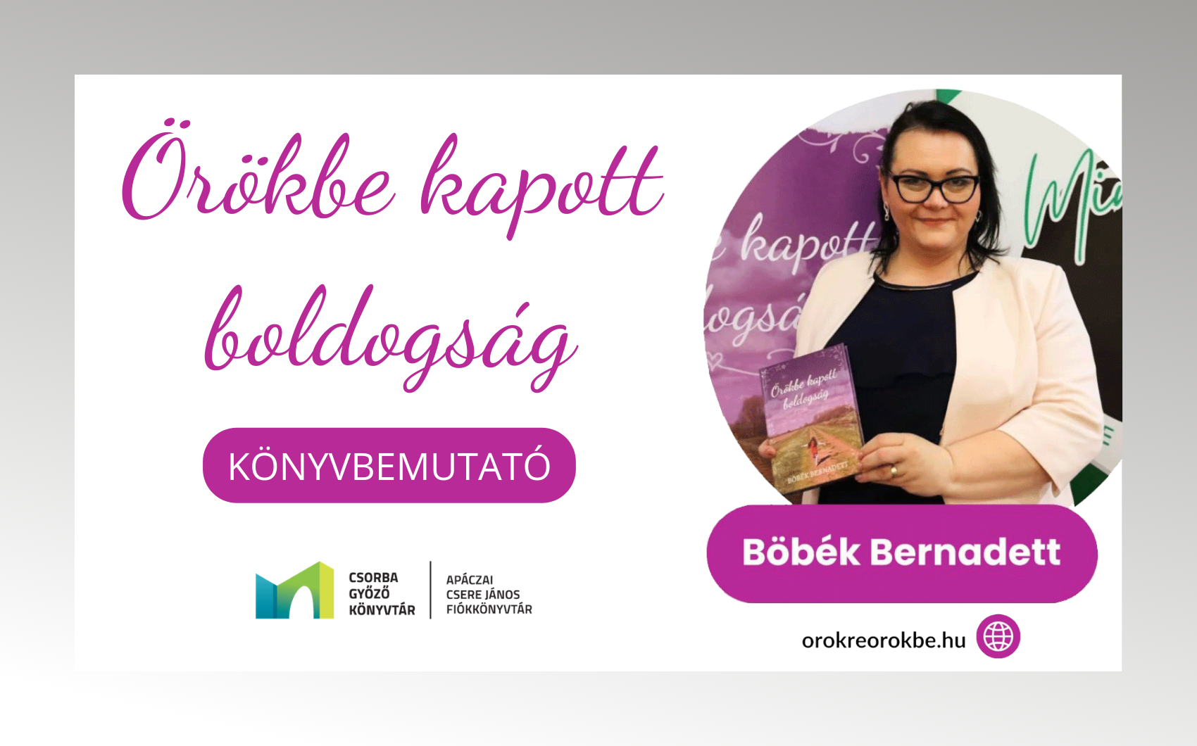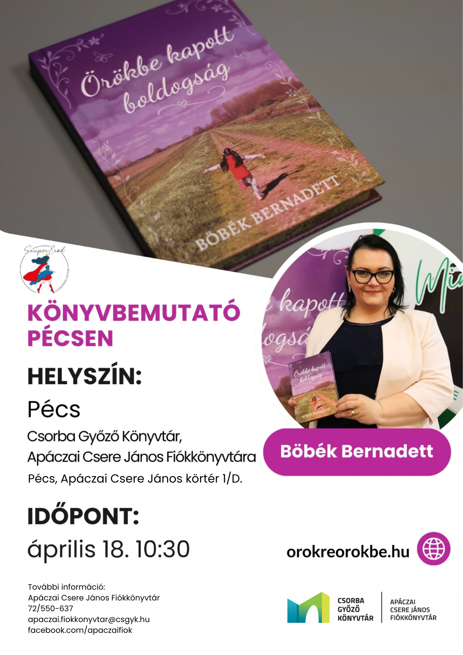 Szeretettel várunk minden érdeklődőt az Apáczai Csere János Fiókkönyvtárba Böbék Bernadett: Örökbe kapott boldogság c. könyvének pécsi bemutatójára.