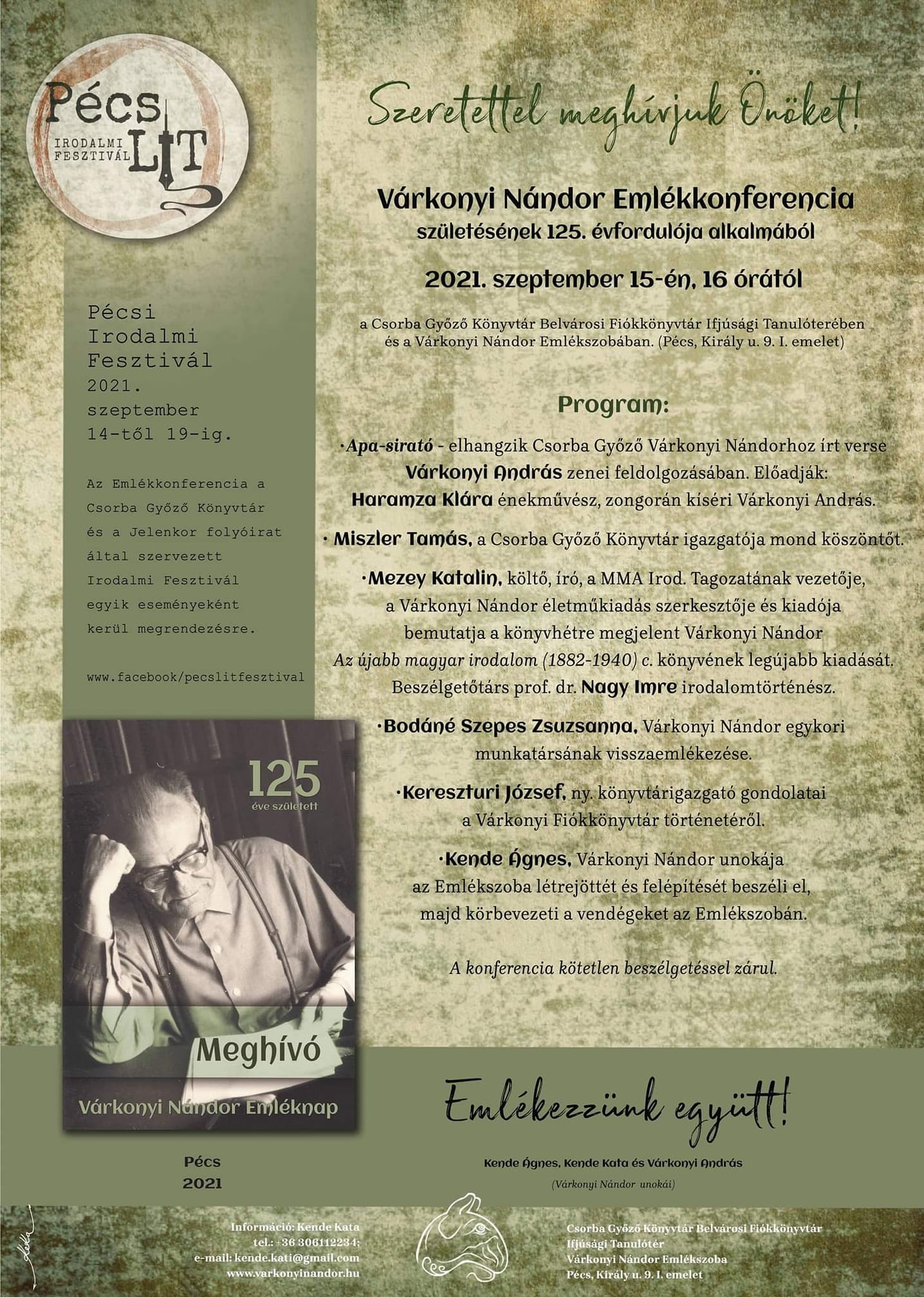 Várkonyi Nándor születésének 125. évfordulója alkalmából Bodáné Szepes Zsuzsanna Várkonyi Nándor egykori munkatársának visszaemlékezését hallgathatjuk meg. Majd Kereszturi József ny. könyvtárigazgató a Várkonyi Fiókkönyvtár történetéről mesél. Mezey Katalin, Kossuth- és József Attila-díjas író, költő, a Várkonyi életmű kiadója bemutatja a könyvhétre megjelent Várkonyi Nándor Az újabb magyar irodalom (1882-1940) című könyvének legújabb kiadását. Beszélgetőtársa prof. dr. Nagy Imre irodalomtörténész lesz. A konferencia végén Kende Ágnes, Várkonyi Nándor unokája bemutatja a Várkonyi Nándor Emlékszobát az érdeklődőknek.