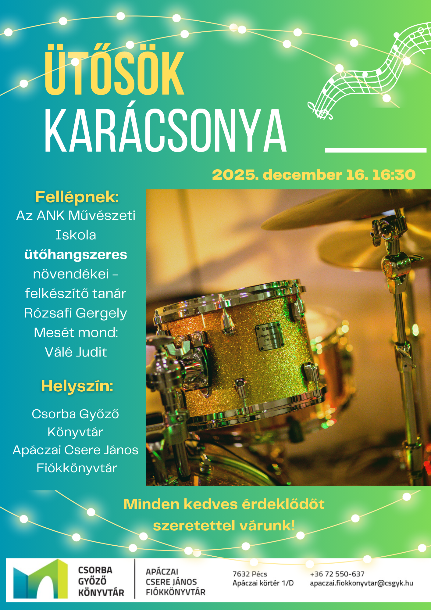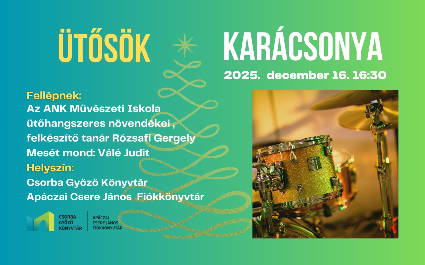 Szeretettel várunk minden érdeklődőt 2025. december 16-án az Apáczai Csere János Fiókkönyvtárban megrendezésre kerülő Ütősök karácsonya című koncerten.
