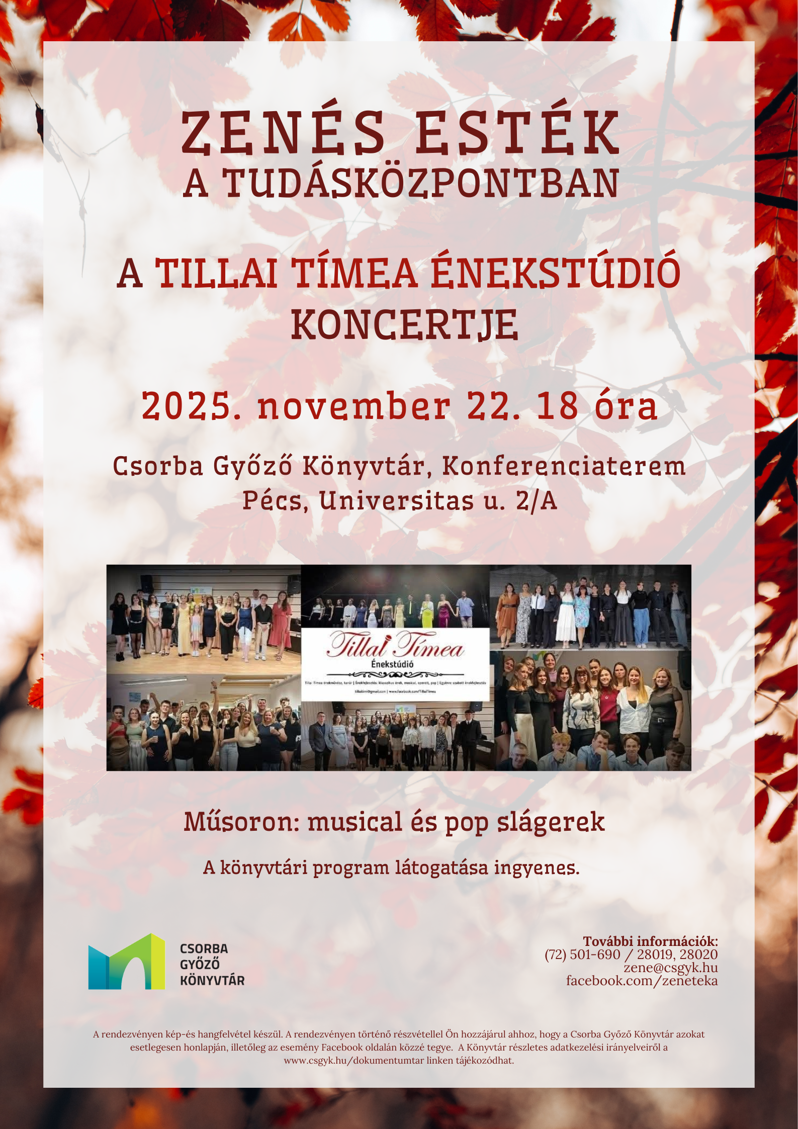 A Csorba Győző Könyvtár Zeneműtára és a Tillai Tímea Énekstúdió közös szervezésében évente kétszer megrendezésre kerülő koncert a könnyűzene szerelmeseinek kínál kellemes kikapcsolódást.