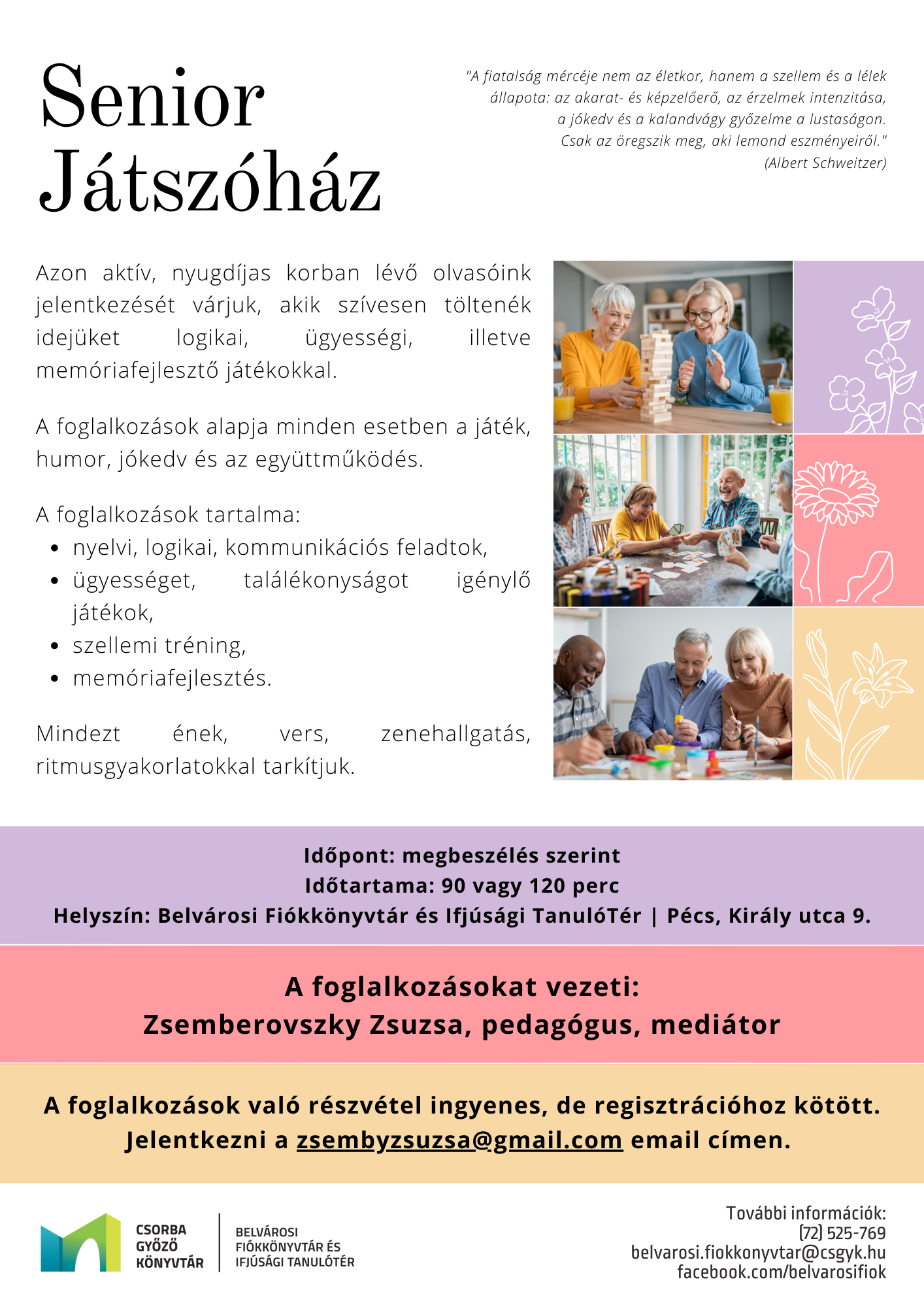 Szerettel várjuk azon aktív, nyugdíjas korban lévő olvasóink jelentkezését, akik szívesen töltenék idejüket logikai, ügyességi, illetve memóriafejlesztő játékokkal.