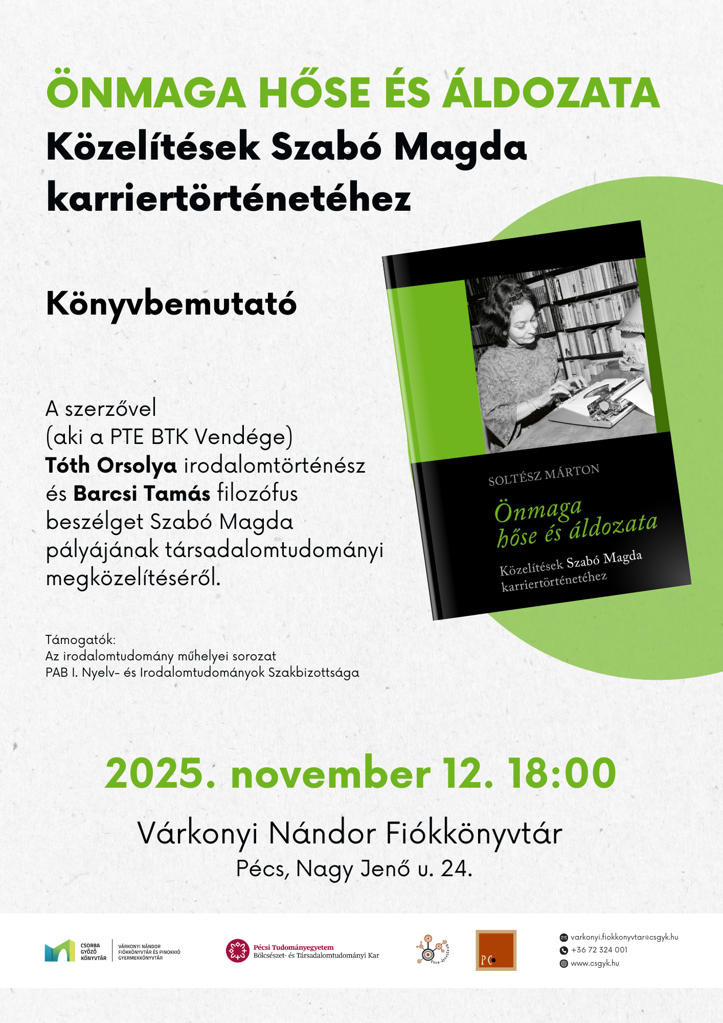 A szerzővel (aki a PTE BTK Vendége) Tóth Orsolya irodalomtörténész és Barcsi Tamás filozófus beszélget Szabó Magda pályájának társadalomtudományi megközelítéséről.